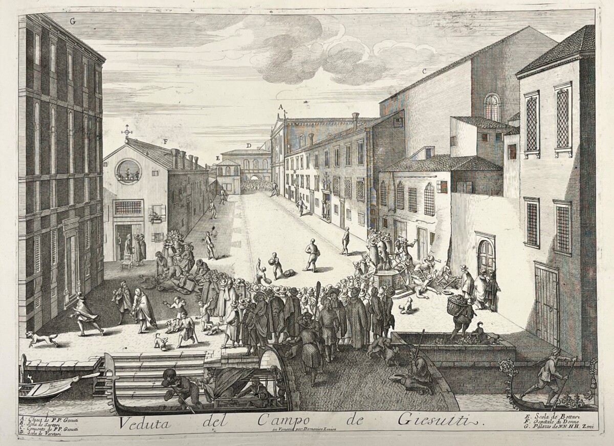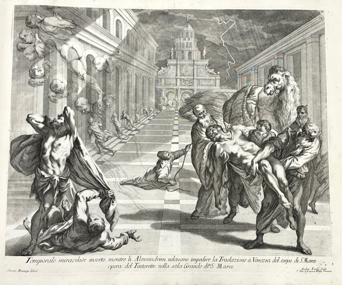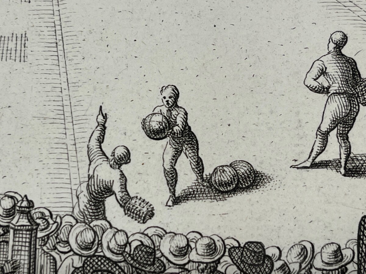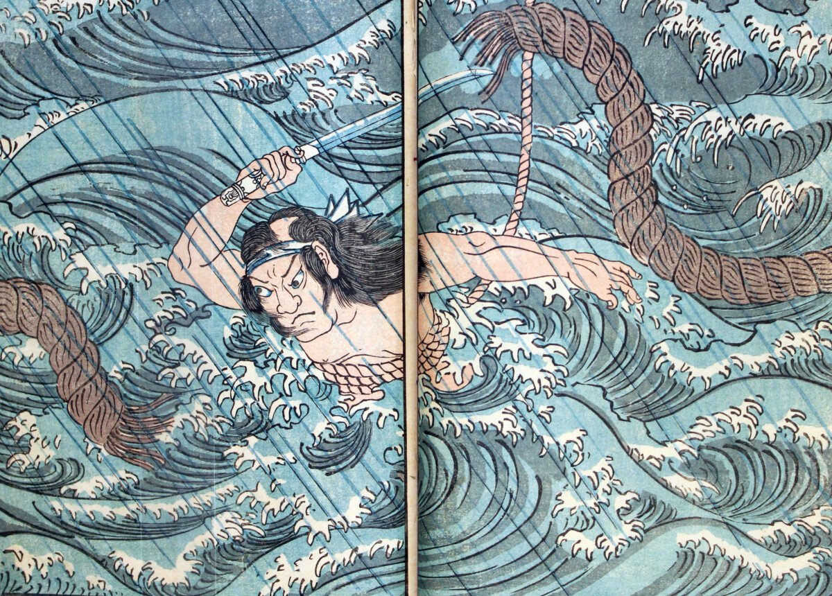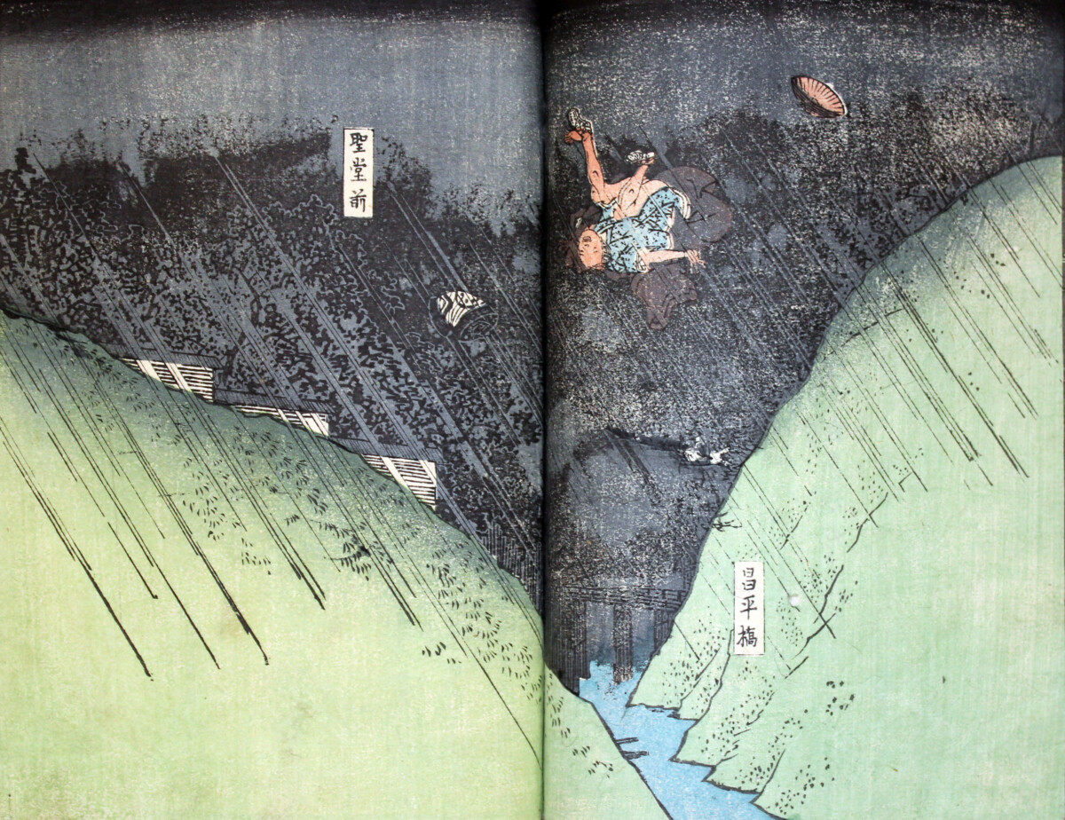 In this scene, the wind from the typhoon is so strong that a man is blown off a mountain near the Shoei Bridge in the Chiyoda section of Tokyo. The Seidō Temple is just visible in the background. This site, one of Hiroshige’s famous 100 Views of Edo, was well known to the very literate Japanese audience. Seeing it manipulated by the artist in this way must have made the visual impact of this scene all the more shocking.