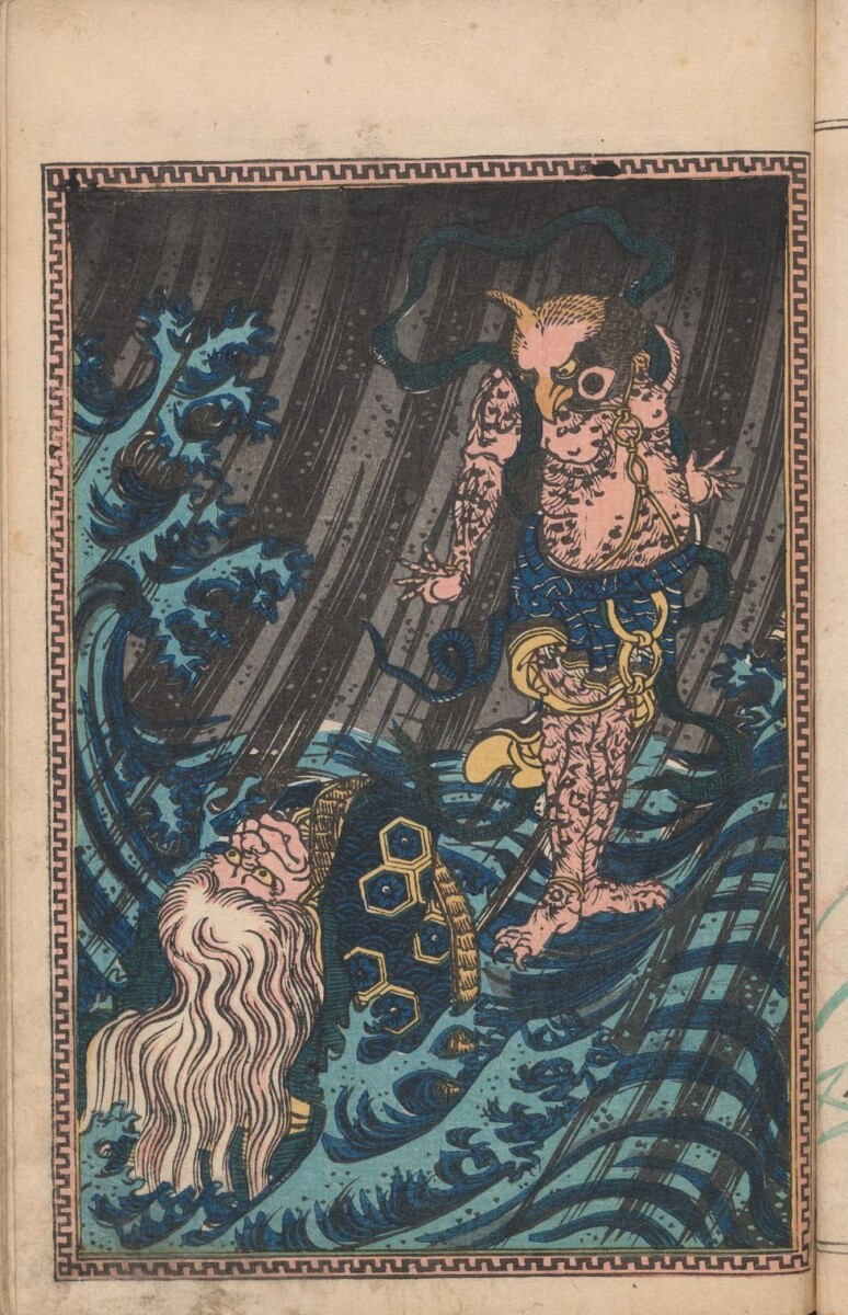 Hiren, the Chinese God of Wind, hovers above an elderly drowning woman in the first illustration for volume 1. Known as a troublemaker, he carries his destructive winds with him in a bag. Robun warns that this image might frighten children.