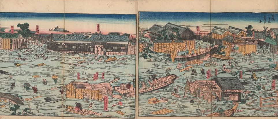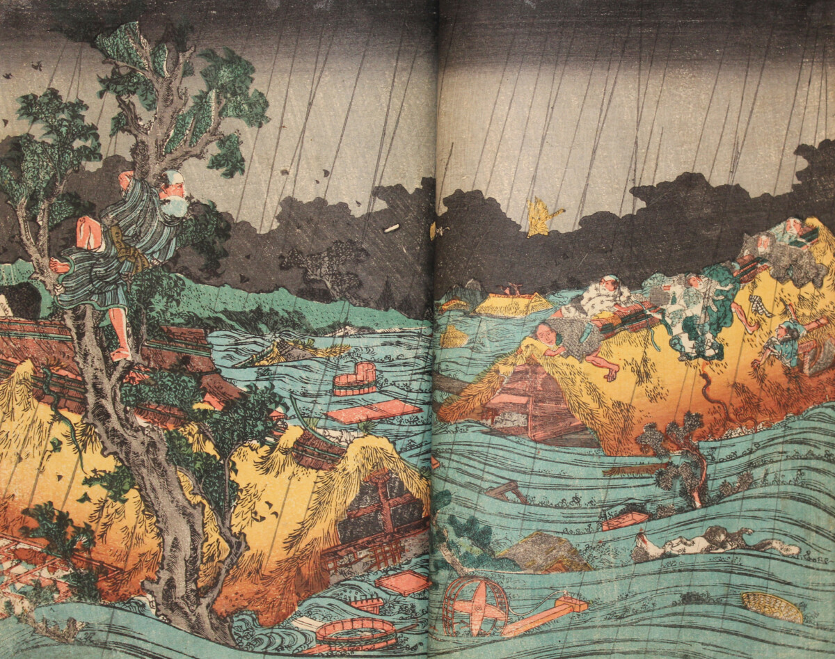 So begins the preface to Natural Disasters of the Ansei Period [Ansei fūbunshū], a harrowing chronicle of disasters that took place in Japan during the first two years of the Ansei period (1854-1860). The era was beset with natural calamities: four major and many minor earthquakes, two tsunami, flu and cholera epidemics that killed hundreds of thousands of people, and a typhoon in 1856. The main focus of this book, however, is the typhoon and the subsequent flooding that took 10,000 lives and wiped out much of northern Edo (present-day Tokyo) and the Izu peninsula. The author, popular fiction writer-turned-journalist, Kanagaki Robun (1829–1894), blends eyewitness accounts, religious and mythological interpretations of events, and powerful images to report these tragic events of the day.