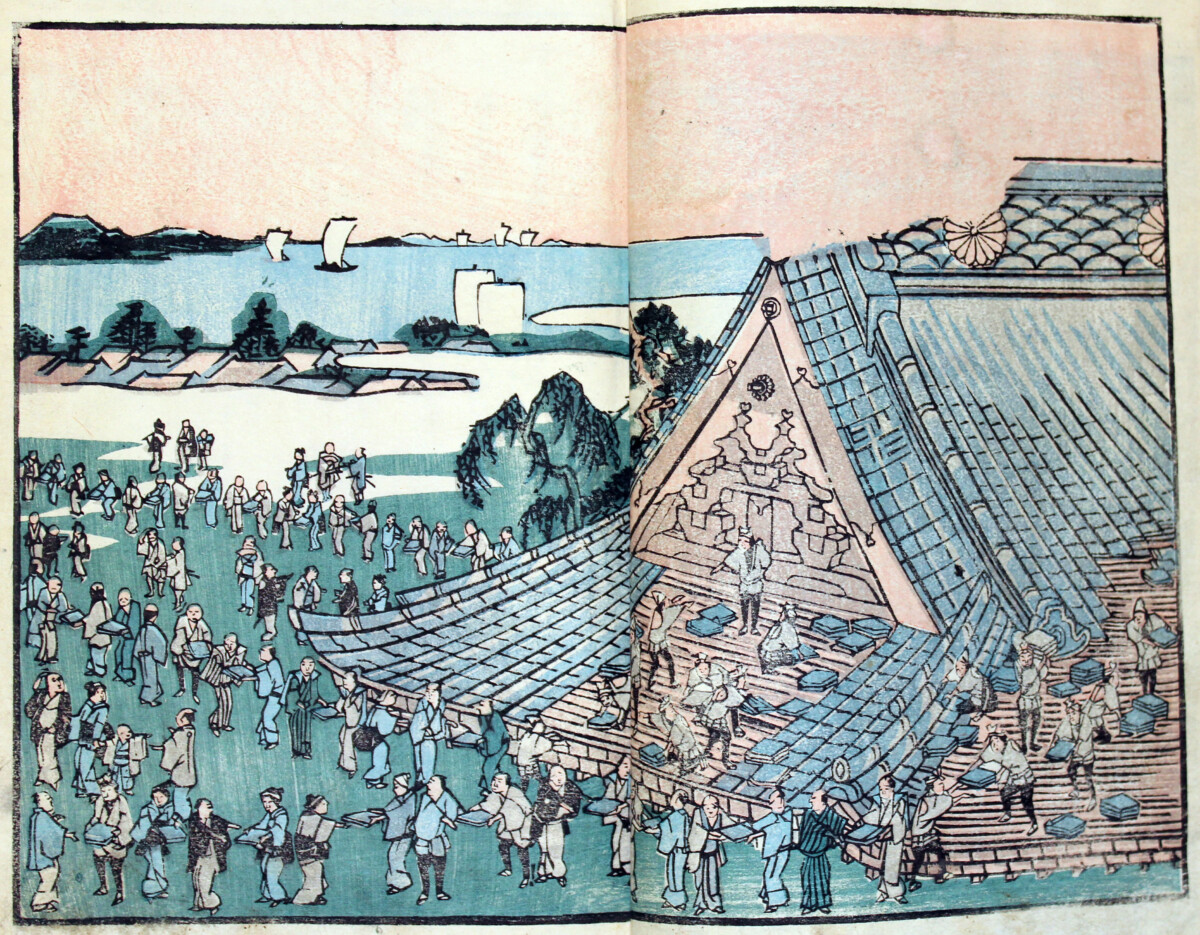 In this scene, repair of the roof has begun on the Teppōzu Inari Shrine, providing work for hundreds of men. The shrine still exists today in Tokyo.